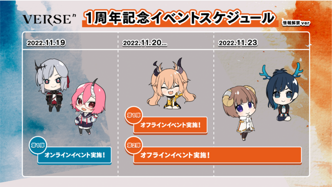 11月19日(土)にて1周年を迎える「VERSEn」は、複数の企画からなる1周年記念イベントの実施を決定しました。オンライン・オフラインを交えたイベントとなり、記念日となる11月19日(土)周辺での開催となります。詳細情報は後日公開となりますので、続報をご期待ください。