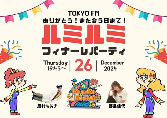 TOKYO FMで放送中の生ワイド番組『Roomie Roomie!』(月-木20:00~20:55生放送)は、12月26日(木)の放送をもって最終回を迎えます。この日の放送は、パーソナリティの野呂佳代と眉村ちあきがリスナーのみなさまに感謝の気持ちを込めて、TOKYO FMホールにて公開生放送でお送りします。ご応募は、12月5日(木)23:59までに、チケット受付サイト( https://tokyofm.zaiko.io/item/368387 )から。みなさま、ぜひご参加ください!