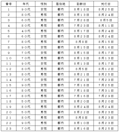 都内で新型コロナウイルスに感染した方が死亡されましたのでお知らせします。