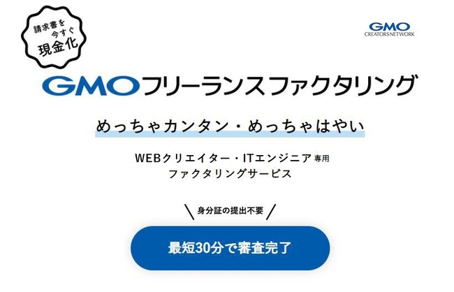GMOインターネットグループのGMOペパボ株式会社(代表取締役社長:佐藤 健太郎)の連結会社であるGMOクリエイターズネットワーク株式会社(代表取締役社長:伊藤 毅 以下、GMOクリエイターズネットワーク)は、本日2022年2月9日(水)より、フリーランス(※1)のWEBクリエイター・ITエンジニア専用ファクタリングサービス「GMOフリーランスファクタリング」(URL:https://freelance.factoring.inc/)を提供開始しました。