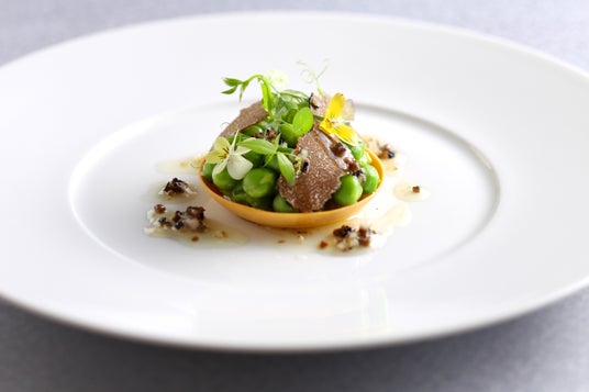 実えんどう タルトレット トリュフ、鹿児島黒牛の炭火焼 黒酢のベアルネーズ 他