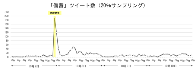 上記グラフに見られるように、地震発生直後、ツイート数は急激に増加しているが、おおよそ1日が経過する頃には、元の水準に戻っている。「備蓄」への関心は、地震発生直後に高くなるものの、翌日、翌々日には低くなってしまうことがわかる。