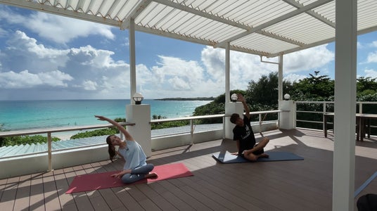 エメラルドグリーンの海と白い雲、青い空が広がる場所でのヨガは開放感抜群で、見ているだけでもデトックスになりそうな映像。赤間インストラクターの声に従って、ヨガ初心者・中村昌也も一緒にヨガを行いますが、終わってひと言「(体が)かたいっすね、俺」と感想を漏らし、それには赤間も思わず笑っていました。