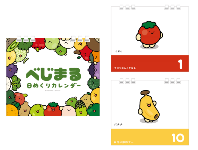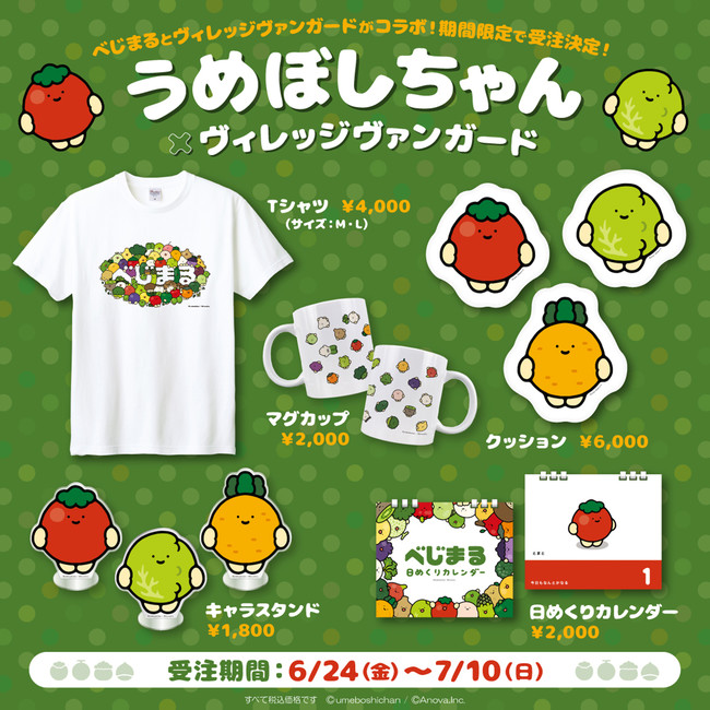 可愛いお野菜さんが大活躍!【うめぼしちゃん】制作の『べじまる』とのコラボグッズがオンラインストアで発売決定!SNSで一度は見た事があるハズなべじまる達をとびきり可愛くグッズにしました!今回の見どころはべじまる達が溢れかえるTシャツや、何と言っても全ページ描き下ろして頂いた日めくりカレンダー!!ファンなら必ず手に入れたいアイテムとなっております!