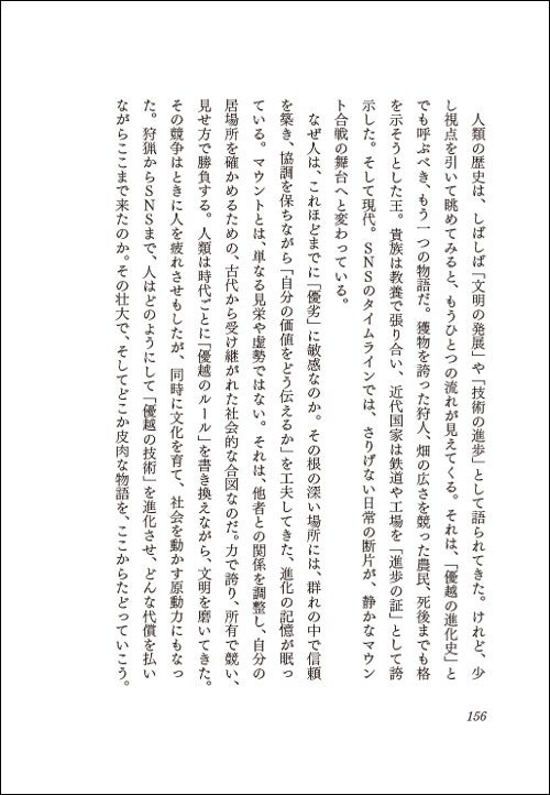 第3章では、人類史のマウントの起源をたどっていきます。遺伝子レベルで組み込まれた「生存本能」としてのマウント───「人類のルーツから現代へ」様々なマウントの歴史を紐解きます。
