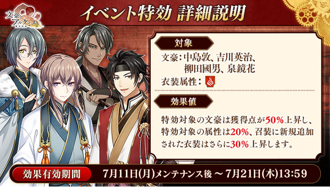 期間中「中島敦」「吉川英治」「柳田國男」「泉鏡花」の衣装を編成して潜書すると、得点の獲得数がそれぞれ50%上昇します。また、「火」属性の衣装を編成して潜書すると、得点の獲得数がそれぞれ20%上昇します。
