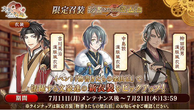 さらに、イベントと同時に開催される限定召装『物書きたちの梁山泊』にて新規追加された「中島敦」「吉川英治」「柳田國男」の〈漢服風衣装〉を編成すると、得点の獲得率がそれぞれ30%上昇します。