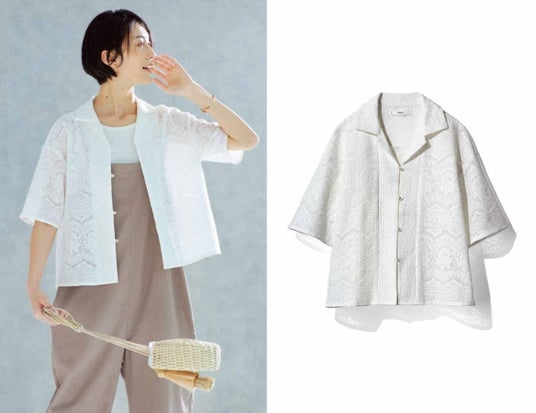 ヨーロッパの映画に出てきそうなムードに心ときめく、総レースの開襟シャツです。全面に花柄と幾何学模様を組み合わせたメッシュレースをあしらって、メリハリのきいたデザインです。コンパクトな短め丈で、スタイルアップして見えます。