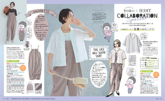フェリシモが展開するブランド、「IEDIT [イディット]」ときくちあつこさんとのコラボ新作が登場、『IEDIT2024夏の増刊号』に掲載し6月7日よりウェブ販売を行っています。第27回目となるコラボ新作は、メッシュレースをあしらった「総レースハーフスリーブシャツ」や、細い肩ストラップが女性らしい 「ルーズサロペット」です。新作はウェブ特集ページのほか、デジタルカタログでもチェックできます。「総レースシャツ」と「ルーズサロペット」を同時に申し込むと合計金額から¥1,210OFFになるキャンペーンを行っています(お申し込み期限:2024年10月31日)。