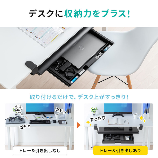 サンワサプライ株式会社(本社:岡山市北区田町1-10-1、 代表取締役社長 山田 和範)が運営している直販サイト『サンワダイレクト』では、デスクに後付けして収納スペースを追加できる、クランプ固定式の引き出し付きキーボードスライダー「100-KB010」を発売しました。