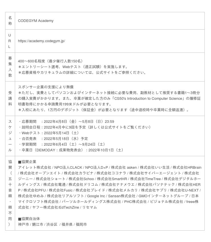 GMOインターネットグループは、株式会社LABOT(本社:東京都渋谷区、代表取締役:鶴田 浩之)が主催する、新型コロナウイルス感染拡大による社会経済の混乱の影響を受けた学生を対象とするプログラミング教育無償提供プロジェクト「CODEGYM Academy」(URL:https://academy.codegym.jp/)に、2022年度もダイヤモンドスポンサーとして協賛いたします。
