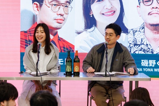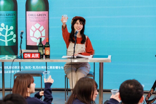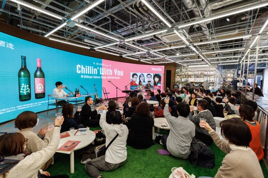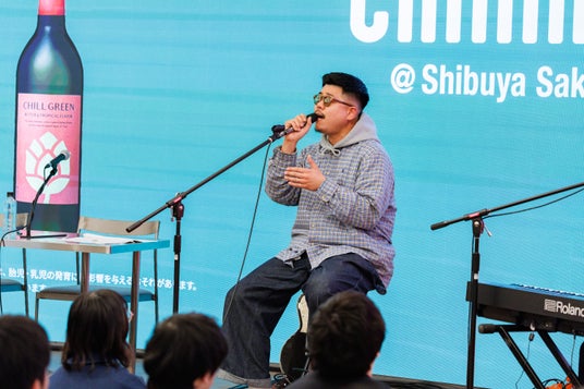 今回は濱田酒造のボタニカル系麦焼酎「CHILL GREEN」にちなみ “チルでリラックス”した時間を届けるというコンセプトのもと、芝生の観客席を設けた会場で開催。当日は、50名のリスナーが集い、「CHILL GREEN」で乾杯しながら、音楽やトークを楽しむくつろぎのひとときを過ごしました。