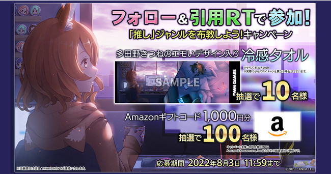 DMM GAMES公式Twitterフォロー&対象ツイートの引用RTを行うことで、抽選でAmazonギフトコード1,000円分・DMM GAMES公式キャラクター「多田野きつね」オリジナルデザインの冷感タオルの豪華賞品が当たるチャンス!
