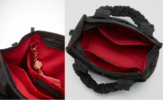 イラストレーターの進藤やす子さんとつくった軽やかなポシェットです。コンパクトな見た目ながら500mlのペットボトルが収納可能です。リボン風の持ち手や赤色の内側が特徴で、持つだけで気分が上がります。ブラックの上品感のある素材で、旅行だけでなくふだん使いにも活躍します。