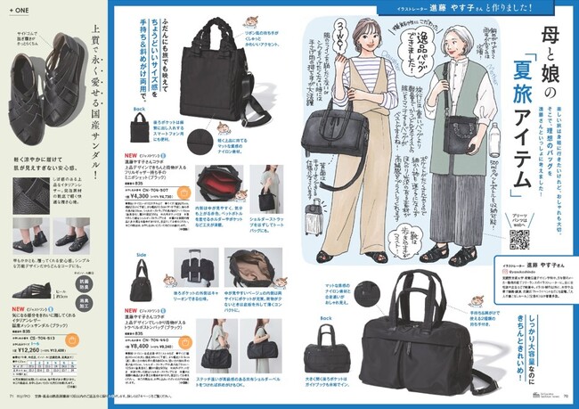 フェリシモが展開するファッションブランド、「IEDIT[イディット]」は、2024年夏の新作アイテムを発表、デジタルカタログ『felissimo fashion news』に掲載して7月5日よりウェブ販売を行っています。旅とファッションを愛するイラストレーター、進藤やす子さんとのコラボ新作は、軽量でしっかり大容量なのにきちんときれいめな「トラベルボストンバッグ」や、手持ち&斜めがけ両用できる「ミニポシェット」で、旅行はもちろん、ふだん使いにも活躍するアイテムです。新作は ウェブ特集ページのほか、デジタルカタログでもチェックできます。