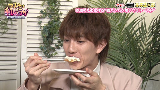 その後、ホットプレートの温度を指で触って確かめるダイナミックな熊プロのクッキングがスタート。「クリームチーズ&いぶりがっこの組み合わせが好き」という赤澤のために、さらにアレンジを加え「じゃがいも&パン」という食べ応えをプラスした一品を作りますが、途中、赤澤のハイボールがこぼれたり、ガスバーナーの火が消せなくなったりといろいろなアクシデント発生。なんとか完成したものを食べた赤澤は「んーーー!サクサク感もあっておいしい!」と絶賛していました。
