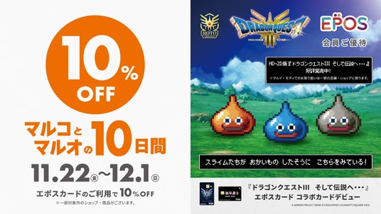 株式会社丸井(本社:東京都 中野区、取締役社長:青野 真博)は、2024年11月22日(金)~12月1日(日)の10日間、マルイ・モディ全店およびマルイのネット通販「マルイウェブチャネル」にて、エポスカード会員ご優待キャンペーン『マルコとマルオの10日間』を開催いたします。期間中、エポスカードのクレジットでのお支払いで、10%OFFにてお買物いただけます。また、今回の『マルコとマルオの10日間』は、HD-2D版『ドラゴンクエストIII そして伝説へ…』の発売を記念してコラボレーション企画を実施いたします。
