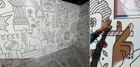 神戸のハイカラ文化をイメージしたモノクロのイラストをそっと触ると、あら不思議!ぬりえができちゃう!犬はどんな色だろう?何色の花だろう?さわって確かめてみて!