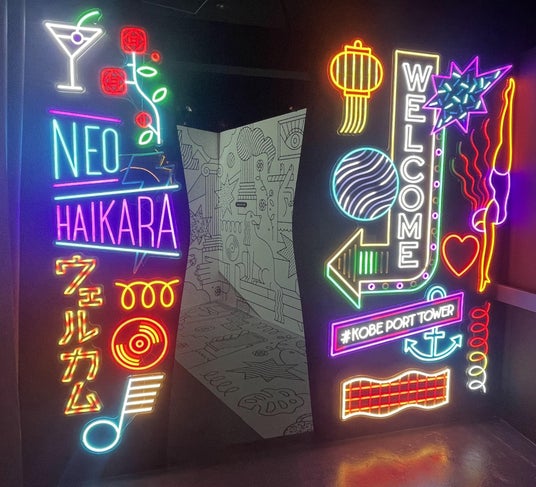 神戸は港町であり、いつだっておしゃれなイメージ。神戸港開港により神戸は西洋のさまざまな文化や習慣が入ってきて、神戸から日本のファッションや生活に大きな変化がもたらされた。そんな神戸のハイカラ文化と異国情緒をLEDネオンで表現したネオハイカラネオン!ウエルカム!ようこそ神戸ポートタワーへ!