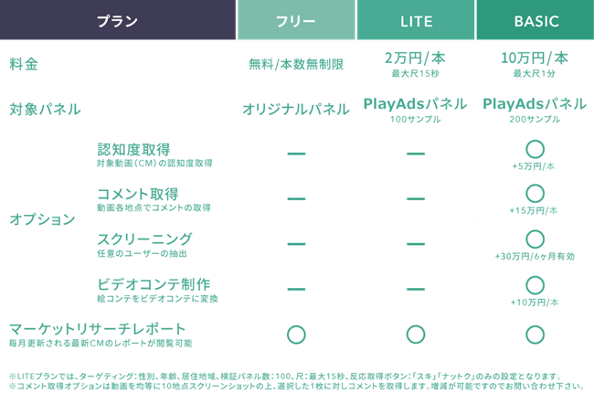 「PlayAds LITE byGMO」は、CM動画1本につき2万円で検証できる完従量課金となりますのでお好きな時にご利用いただけます。検証結果の分析のサポートや、詳細なターゲティング設定等オプションを加え調査をしたい場合は、国内初の感情取得技術(特許取得済/特許番号:6745393号)を取り入れたCM動画の効果検証SaaSツール「PlayAds byGMO」(URL:https://www.playads.jp/)の「BASIC(ベーシック)」プランをご利用ください。
