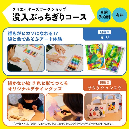 ・ワークショップによっては、アイロンやグルーガンを使用しますので、小学生のお子さまが参加する場合、保護者の方のサポートをお願いします。