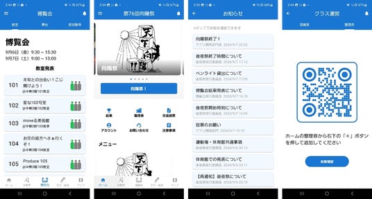 あまり普及していない「学校祭アプリ」のスタンダードとなるべく、向陽祭のために生徒のみで制作したアプリ。混雑の解消が課題だった向陽祭において、紙の整理券やタブレット端末を使わずにスマホだけで完結する整理券のシステムや、発表ごとの混雑度表示の機能も搭載。不正防止も含め、最小限のコストで、向陽祭に欠かせないアプリとなりました。
