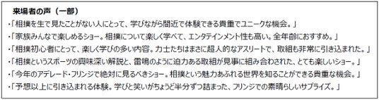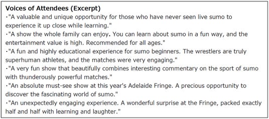 「The Sumo Show HIRAKUZA」は現地メディアから多数の5つ星評価を獲得したほか、来場者からも高い評価を受けました。
