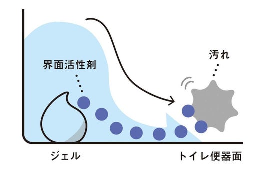 水を流すたびにジェルから界面活性剤が溶け出し、便器表面についた汚れを浮かせて洗い流します。