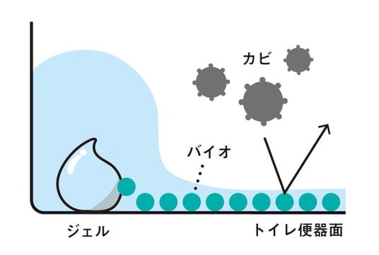 水を流すとジェルからバイオが溶け出して便器の表面に付着。カビや汚れがこびりつくのを防ぎます。