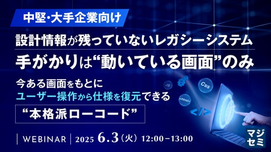 マジセミ株式会社は「【中堅・大手企業向け】設計情報が残っていないレガシーシステム――手がかりは“動いている画面”のみ」というテーマのウェビナーを開催します。
