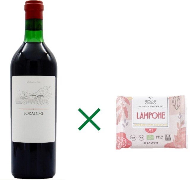 テロルデゴが持つ強めのベリーの香りとラズベリーチョコの相性は最強です!また、しなやかでのびやかなタンニンは、スミレのような香りのローチョコレートによく合います。