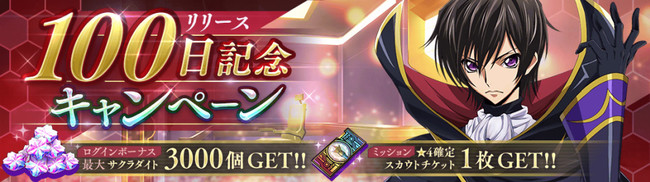 ログインボーナス、デイリースタミナ半減、100日記念ミッションが期間限定で登場!期間限定ミッションクリアで★4確定スカウトチケットが手に入ります!