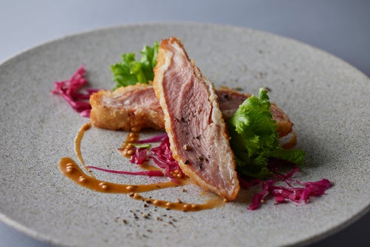 前菜には、竹炭を練り込んだシューの中にニンニクで香り付けをした白身魚とじゃがいもをペースト状にし、小エビとロマネスコを飾った「白身魚のブランダードエクレア サフランマヨネーズ」をご用意しました。鮮やかな色彩のサフランマヨネーズと合わせてお楽しみください。メインディッシュでお選びいただける「鴨のフリット タスマニアマスタードソース」はしっとりジュージーに仕上げました。シュークルートや、プチプチ食感のタスマニアマスタードのソースと合わせることで重たすぎず、あっさりと召し上がりいただけます。