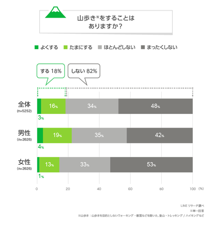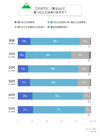 このたびLINEリサーチでは、日本全国の男女を対象に、2月23日の富士山の日にちなんで、ふだん山歩きをする人の割合や富士山に登ったことがある人の割合について調査しましたので、その結果をお知らせいたします。