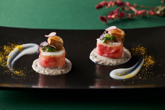 世界三大珍味であるキャビアと、脂の乗ったブリ、さらに毛蟹やウニといった豪華海鮮食材をたっぷりと最中に閉じ込めたアミューズから始まり、クリスマス気分をより一層盛り上げるスペシャルなラインアップをご用意しました。タスマニアサーモンに赤アンディーブのピクルスを添えてクリスマスカラーに仕上げた一皿や、芳醇な香りのオマール海老のスープ、生ベーコンで巻いた鮟鱇のほか、メインには鹿児島県産黒牛のグリルが登場。聖なる夜にふさわしい、贅沢なコースをお届けします。