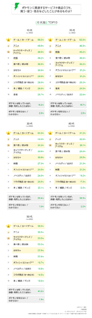 年代別にみると、「アニメ」は30代以下で割合が高く、特に10~20代で高い割合となっています。また、10~20代で「映画」の割合も高く、10代では4位、20代では3位にランクイン。30代以降は「映画」の順位がやや下がり、代わりに「食べ物」や「おもちゃ」が上位にランクインしています。