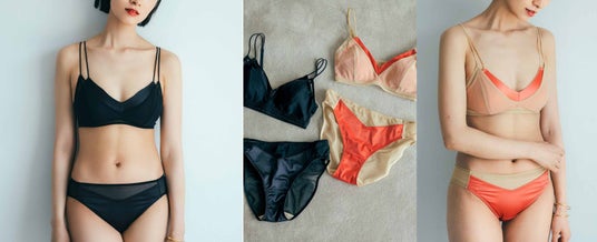 『MEDE 19F』のヴィンテージ感と『flufeel』のボディへの思いを形にしたブラ&ショーツです。光沢感のあるサテンに透け感のあるネットを重ねた洗練されたデザインです。バストは自然なまま、カップ裏やショーツのクロッチは綿100%で、肌心地のよさにもこだわっています。