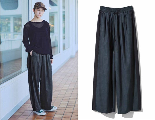 スーツライクなストライプ生地に、ウエストは総ゴム&ひも仕様のパンツです。腰まわりにタックを入れてゆとりを持たせ、無地のサイドラインが細見せ効果を発揮。夏の終わりから秋にかけてさらっと着こなせて、体形カバーも叶える一本です。