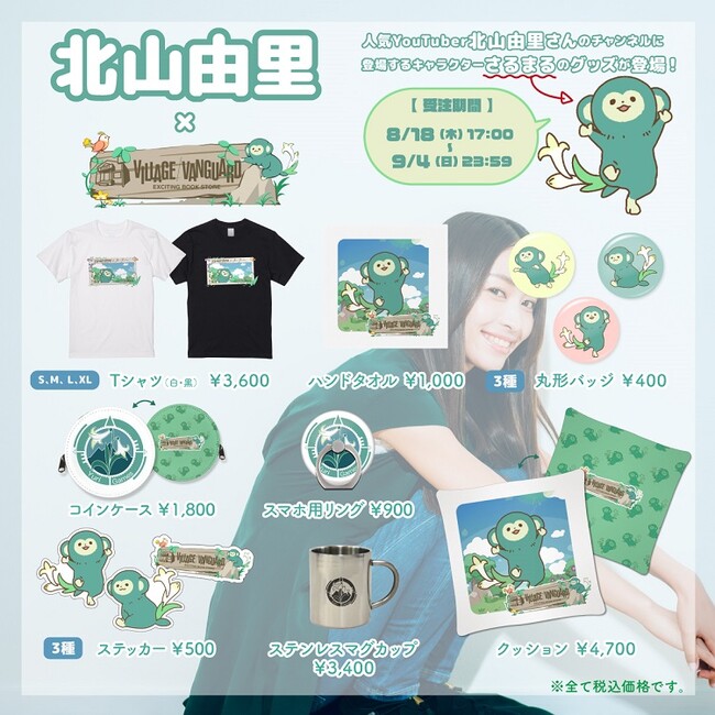 2022年8月18日(木)より、待望の【北山由里×ヴィレッジヴァンガード】コラボグッズがオンラインストアで受注販売スタート!!ゲームプレイ動画を中心に、日本国内から海外まで様々な場所で人気のYouTuber『北山由里』さんのチャンネルに登場するキャラクター『さるまる』のグッズが登場!グッズを手に入れてゲームや動画を一緒に楽しもう!オンライン限定予約なので見逃し注意です!
