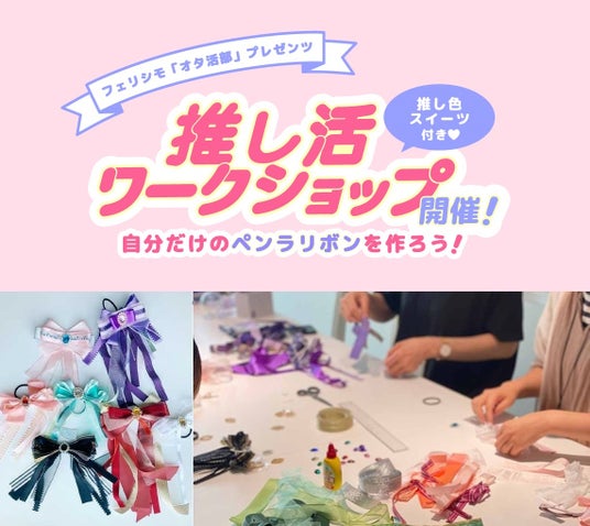 フェリシモが展開する「フェリシモ部活」のひとつ「オタ活部」は、2023年に初開催した推し活ワークショップを2024年10月19日(土)に神戸で開催します。自分だけのペンラリボン(ペンライトリボン)を作るワークショップで、ペンライトに付けてライブやイベントに向かえばテンションアップ間違いなしの“推し活グッズ”を制作します。フェリシモの手芸・手づくりキットブランドCouturier[クチュリエ]が、世界が注目する日本製の「MOKUBAリボン」の5万点にものぼるコレクションから厳選したリボンセットから推し色のリボンを選んで使い手づくりします。ペンラリボンが完成したら、「推し色スイーツ」でブレイクタイム。完成したペンラリボンの撮影をしたり、参加者同士やオタ活部の部員と交流をして推しトークをしたりして楽しみます。推しジャンルを問わず参加することができるので、推し友と一緒に参加しても、ひとりで参加しても、推し活トークで盛り上がることができる楽しいイベント(おみやげ付き)です。