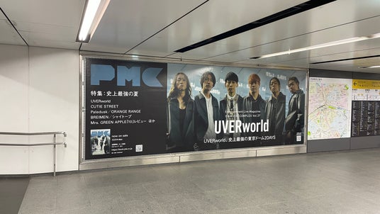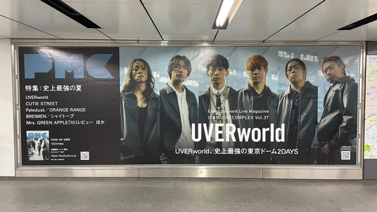 7月15日(火)発売予定の『ぴあMUSIC COMPLEX(PMC) Vol.37』。本日7月14日(月)より7月20日(日)までの期間、東京・東横線渋谷駅にて表紙を飾るUVERworldの写真を使った大型ビルボードの掲出を実施いたします。