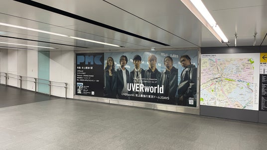 7/14-7/20の期間、東京・東横線渋谷駅B4F改札内コンコース。UVERworldが表紙を飾る『ぴあMUSIC COMPLEX(PMC) Vol.37』大型ビルボード/撮影:伊藤慎平