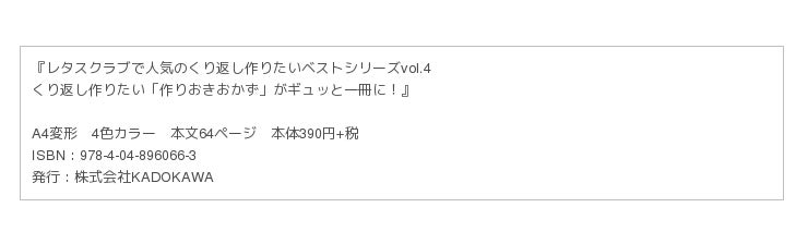 株式会社KADOKAWA(本社:東京都千代田区、代表取締役社長:松原眞樹)は『レタスクラブで人気のくり返し作りたいベストシリーズ』第四弾、『くり返し作りたい「作りおきおかず」がギュッと一冊に!』を9月6日(水)に発売します。