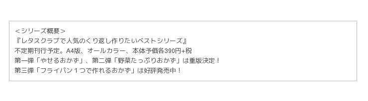シリーズ第4弾は『レタスクラブ』でいつも反響の大きかった「作りおきおかず」です。