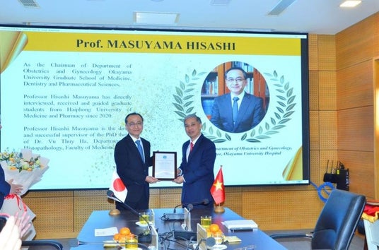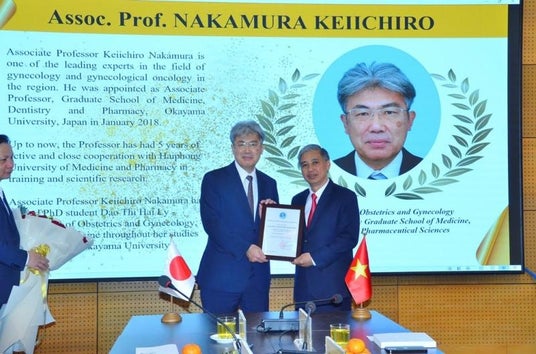 国立大学法人岡山大学(本部:岡山市北区、学長:那須保友)と大学間協定を結ぶベトナム・ハイフォン医科薬科大学で2025年11月28日、名誉教授授与式が行われ、学術研究院医歯薬学域(医)産科・婦人科学の増山寿教授と中村圭一郎准教授が名誉教授の称号を付与されました。