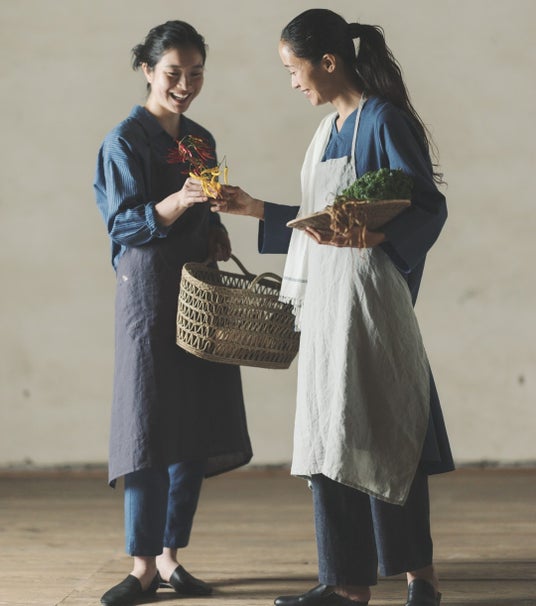 洗いをかけた薄手のリネンエプロン。そのままお買い物に出られそうなかわいさです。
