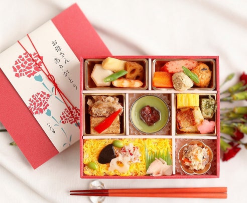 華やかなちらし寿司に赤魚西京焼、牛すき焼、出汁の風味豊かな煮物、甘味には抹茶プリンなどの彩り豊かなこだわりの料理をお詰めしました。