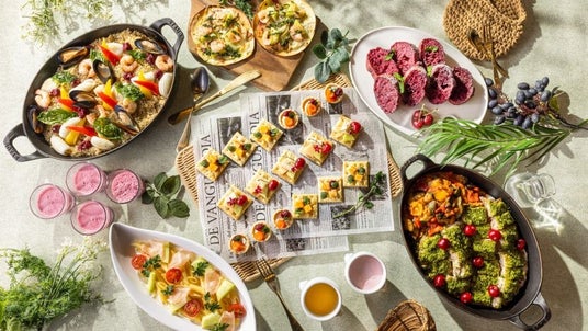 ムール貝やイカなどの魚介類をふんだんに使った彩り豊かな「シーフードピラフ」やメロンと生ハムを絡めたペンネメニューなど、この時期ならではの全30品以上のメニューをお楽しみください。