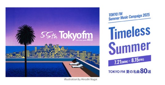TOKYO FMでは、2025年7月21日(月・祝)~8月15日(金)、<TOKYO FM Summer Music Campaign 2025>『Timeless Summer』を展開します。TOKYO FMが開局した1970年から2025年までの55年の夏を彩った楽曲の中から、時代を超えてもなお輝きを放つタイムレスな名曲を“Timeless Summer選曲委員会”がセレクト。TOKYO FMの周波数と同じ全80曲を7つのワイド番組の中でお届けしていきます。 キャンペーンビジュアルは、数々の名作ジャケットビジュアルを生み出したイラストレーターの永井博の作品。キャンペーン特設HPに掲載するほか、キャンペーンビジュアル特製ステッカーやオリジナルQUOカードPayを1,500円×総勢500名様へプレゼントするTOKYO FM公式Xフォロー&リポストキャンペーンも同時展開いたします。どうぞご期待ください。