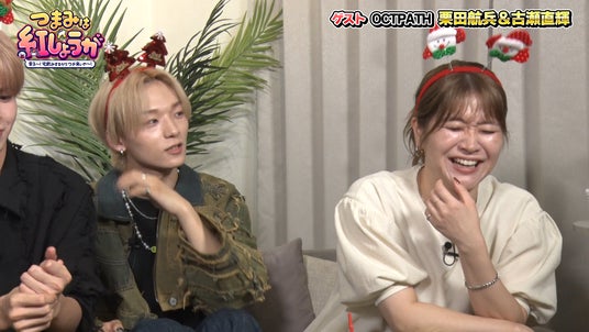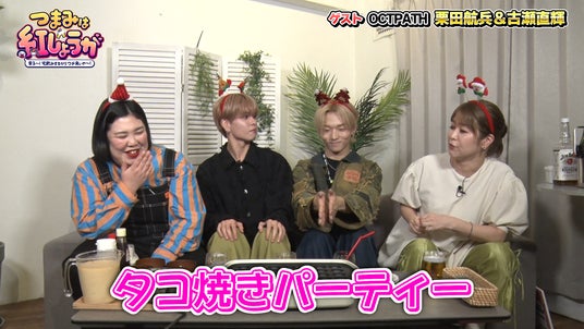 今回の素敵な男子ゲストは、OCTPATHから栗田航兵と古瀬直輝。クリスマスならではのカチューシャをつけた2人はキラキラが止まりません。オクトパス(タコ)にちなんで、今回はたこ焼きパーティーをすることに。栗田は「愛媛出身なんですけど、たこ焼き、プロです!」と自信をのぞかせます。それを聞いた稲田は「なら作ってもらいたいね!」と言って、栗田にも作ってもらうことに。